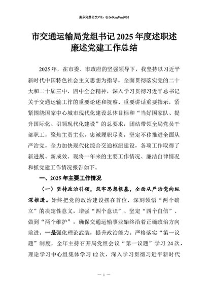【七哥公文】2026年:市交通运输局党组书记2025年度述职述廉述党建工作总结+更多免费公文+VX:QiGeGongWen2024