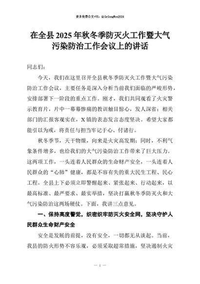 【七哥公文】2026年:在全县2025年秋冬季防灭火工作暨大气污染防治工作会议上的讲话+更多免费公文+VX:QiGeGongWen2024