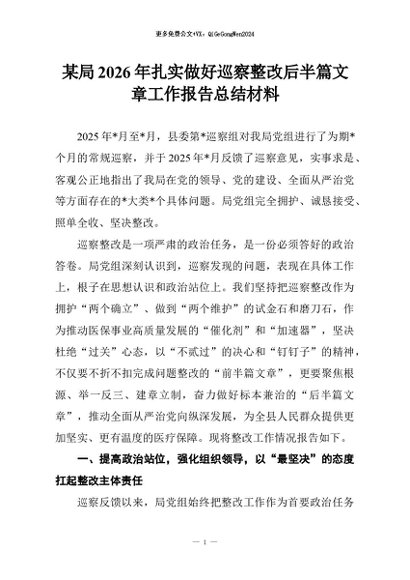【七哥公文】2026年:某局2026年扎实做好巡察整改后半篇文章工作报告总结材料+更多免费公文+VX:QiGeGongWen2024