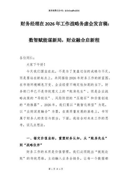 【七哥公文】2026年:财务经理在2026年工作战略务虚会发言稿:数智赋能谋新局,财业融合启新程_副本+更多免费公文+VX:QiGeGongWen2024