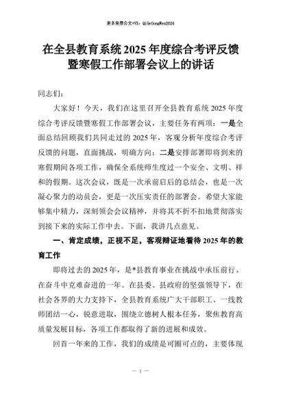 【七哥公文】2026年:在全县教育系统2025年度综合考评反馈暨寒假工作部署会议上的讲话+更多免费公文+VX:QiGeGongWen2024