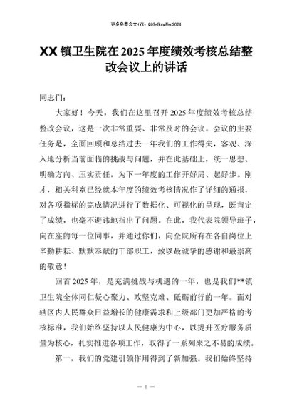 【七哥公文】2026年:XX镇卫生院在2025年度绩效考核总结整改会议上的讲话+更多免费公文+VX:QiGeGongWen2024