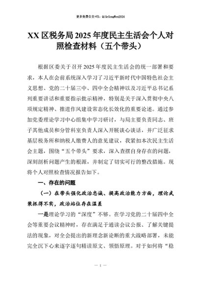 【七哥公文】2026年:XX区税务局2025年度民主生活会个人对照检查材料(五个带头)+更多免费公文+VX:QiGeGongWen2024