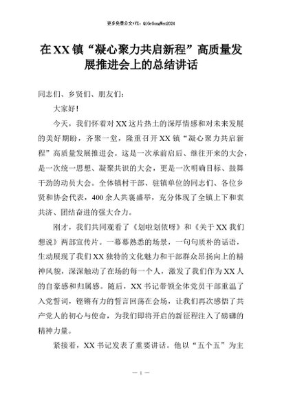 【七哥公文】2026年:在XX镇“凝心聚力共启新程”高质量发展推进会上的总结讲话+更多免费公文+VX:QiGeGongWen2024