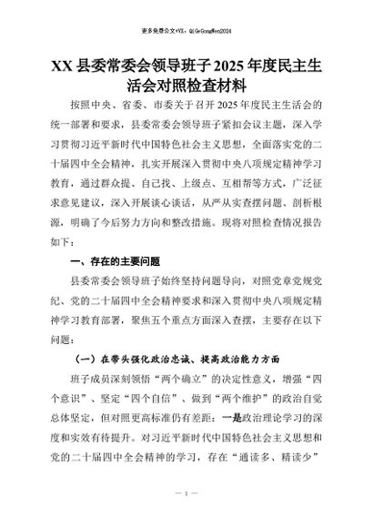 【七哥公文】2026年:XX县委常委会领导班子2025年度民主生活会对照检查材料+更多免费公文+VX:QiGeGongWen2024