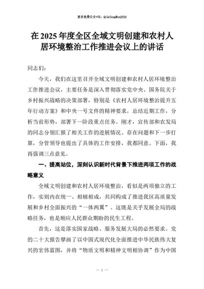 【七哥公文】2026年:在2025年度全区全域文明创建和农村人居环境整治工作推进会议上的讲话+更多免费公文+VX:QiGeGongWen2024