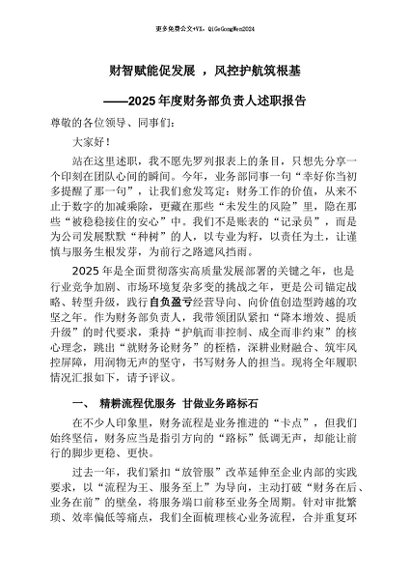 【七哥公文】2026年:2025年度财务部负责人述职报告:财智赋能促发展 ,风控护航筑根基+更多免费公文+VX:QiGeGongWen2024