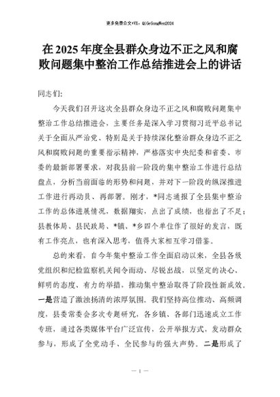 【七哥公文】2026年:在2025年度全县群众身边不正之风和腐败问题集中整治工作总结推进会上的讲话+更多免费公文+VX:QiGeGongWen2024