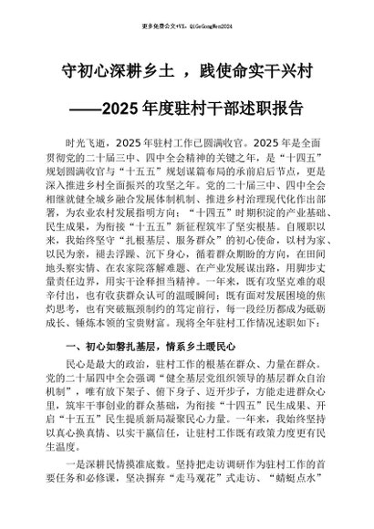 【七哥公文】2026年:2025年度驻村干部述职报告:守初心深耕乡土 ,践使命实干兴村+更多免费公文+VX:QiGeGongWen2024