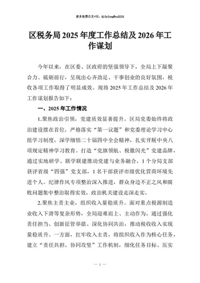【七哥公文】2026年:区税务局2025年度工作总结及2026年工作谋划+更多免费公文+VX:QiGeGongWen2024