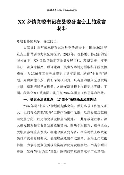 / 【七哥公文】2026年:XX乡镇党委书记在县委务虚会上的发言材料+更多免费公文+VX:QiGeGongWen2024