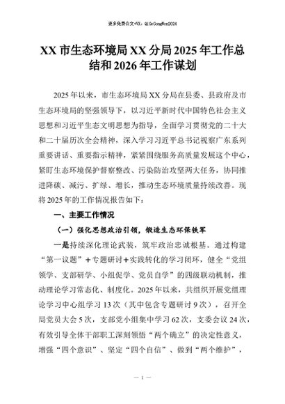 【七哥公文】2026年:XX市生态环境局XX分局2025年工作总结和2026年工作谋划+更多免费公文+VX:QiGeGongWen2024