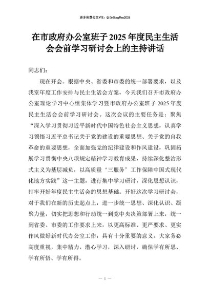 【七哥公文】2026年:在市政府办公室班子2025年度民主生活会会前学习研讨会上的主持讲话+更多免费公文+VX:QiGeGongWen2024