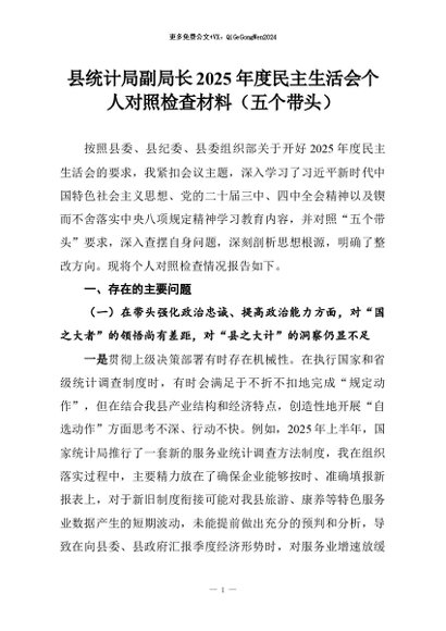 【七哥公文】2026年:县统计局副局长2025年度民主生活会个人对照检查材料(五个带头)+更多免费公文+VX:QiGeGongWen2024