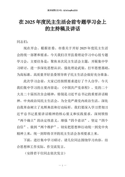 【七哥公文】2026年:在2025年度民主生活会前专题学习会上的主持稿及讲话+更多免费公文+VX:QiGeGongWen2024