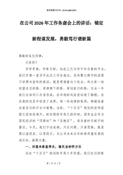 【七哥公文】2026年:在公司2026年工作务虚会上的讲话:锚定新程谋发展,勇毅笃行谱新篇+更多免费公文+VX:QiGeGongWen2024