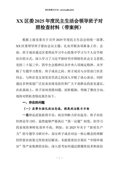 【七哥公文】2026年:XX区委2025年度民主生活会领导班子对照检查材料(带案例)+更多免费公文+VX:QiGeGongWen2024