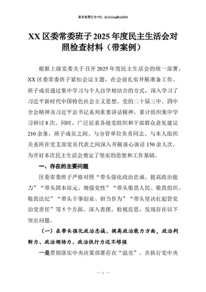 【七哥公文】2026年:XX区委常委班子2025年度民主生活会对照检查材料(带案例)+更多免费公文+VX:QiGeGongWen2024