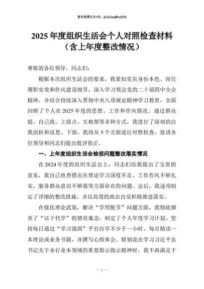 【七哥公文】2026年:2025年度组织生活会个人对照检查材料(含上年度整改情况)+更多免费公文+VX:QiGeGongWen2024
