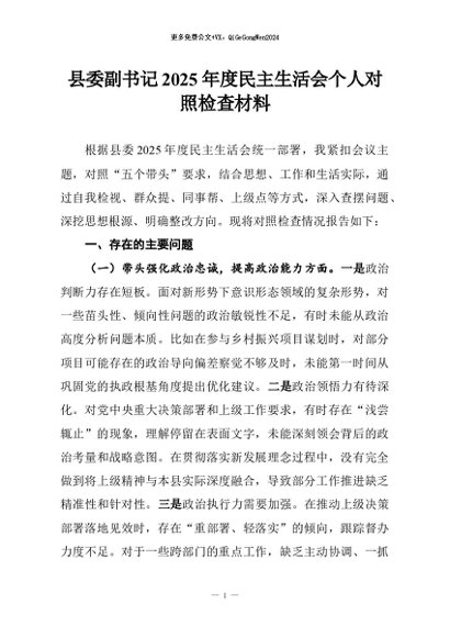【七哥公文】2026年:县委副书记2025年度民主生活会个人对照检查材料+更多免费公文+VX:QiGeGongWen2024