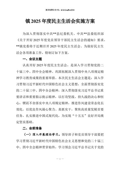 【七哥公文】2026年:镇2025年度民主生活会实施方案+更多免费公文+VX:QiGeGongWen2024