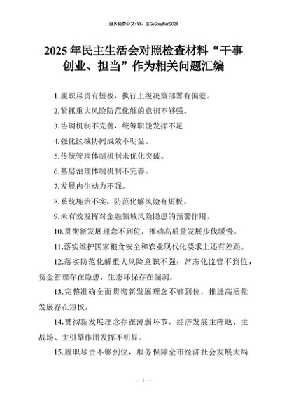 【七哥公文】2026年:2025年民主生活会对照检查材料“干事创业、担当”作为相关问题汇编+更多免费公文+VX:QiGeGongWen2024