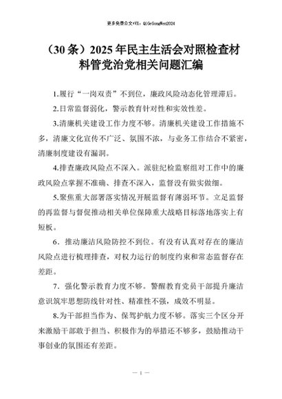 【七哥公文】2026年:(30条)2025年民主生活会对照检查材料管党治党相关问题汇编+更多免费公文+VX:QiGeGongWen2024