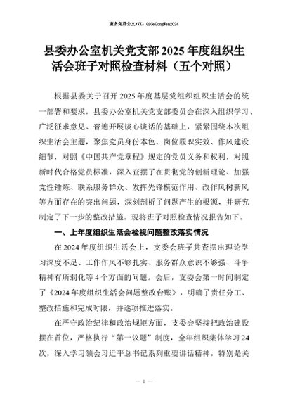 【七哥公文】2026年:县委办公室机关党支部2025年度组织生活会班子对照检查材料(五个对照)+更多免费公文+VX:QiGeGongWen2024