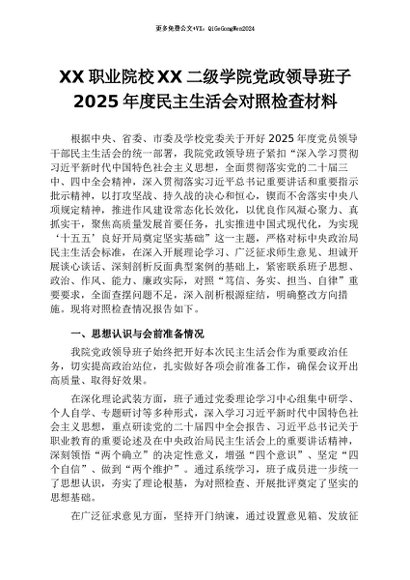 【七哥公文】2026年:XX职业院校XX二级学院党政领导班子2025年度民主生活会对照检查材料+更多免费公文+VX:QiGeGongWen2024