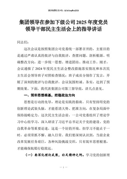 【七哥公文】2026年:集团领导在参加下级公司2025年度党员领导干部民主生活会上的指导讲话+更多免费公文+VX:QiGeGongWen2024