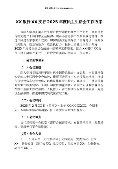/ 【七哥公文】2026年:XX银行XX支行2025年度民主生活会工作方案+更多免费公文+VX:QiGeGongWen2024