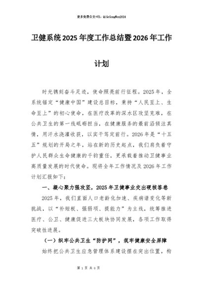 【七哥公文】2026年:卫健系统2025年度工作总结暨2026年工作计划+更多免费公文+VX:QiGeGongWen2024