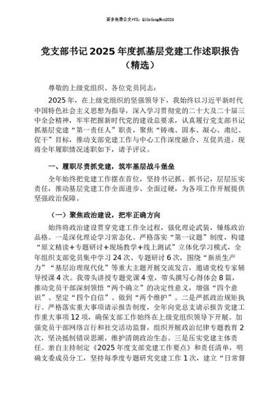 【七哥公文】2026年:党支部书记2025年度抓基层党建工作述职报告(精选)+更多免费公文+VX:QiGeGongWen2024