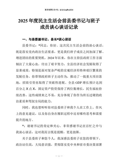 【七哥公文】2026年:2025年度民主生活会前县委书记与班子成员谈心谈话记录+更多免费公文+VX:QiGeGongWen2024