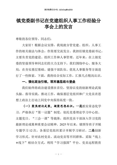 【七哥公文】2026年:镇党委副书记在党建组织人事工作经验分享会上的发言+更多免费公文+VX:QiGeGongWen2024