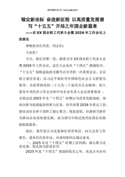【七哥公文】2026年:锚定新坐标 奋进新征程 以高质量发展谱写“十五五”开局之年国企新篇章——在XX国企职工代表大会暨2026年工作会议上的报告+更多免费公文+VX:QiGeGongWen2024