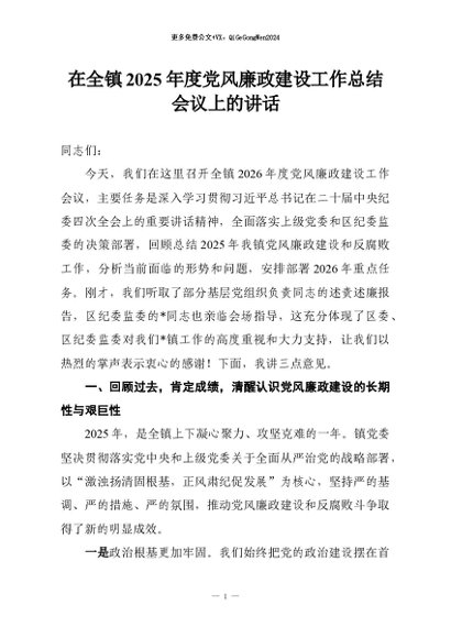【七哥公文】2026年:在全镇2025年度党风廉政建设工作总结会议上的讲话+更多免费公文+VX:QiGeGongWen2024