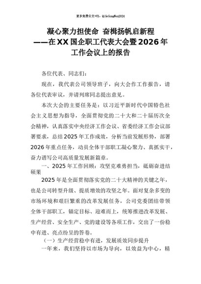 【七哥公文】2026年:凝心聚力担使命 奋楫扬帆启新程——在XX国企职工代表大会暨2026年工作会议上的报告+更多免费公文+VX:QiGeGongWen2024