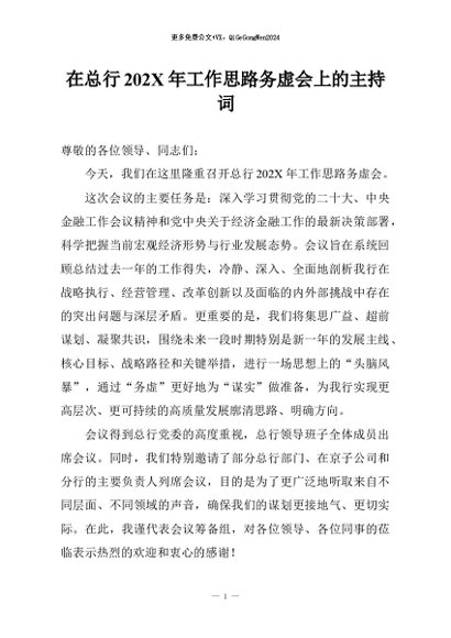 / 【七哥公文】2026年:在总行202X年工作思路务虚会上的主持词+更多免费公文+VX:QiGeGongWen2024