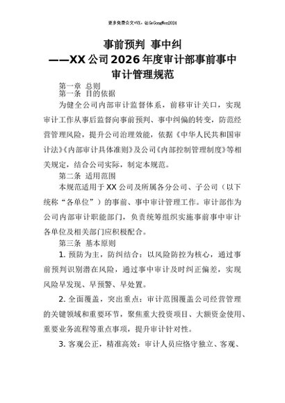 【七哥公文】2026年:事前预判 事中纠——XX公司2026年度审计部事前事中审计管理规范+更多免费公文+VX:QiGeGongWen2024