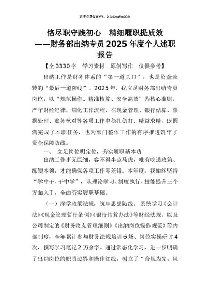 【七哥公文】2026年:恪尽职守践初心 精细履职提质效——财务部出纳专员2025年度个人述职报告+更多免费公文+VX:QiGeGongWen2024