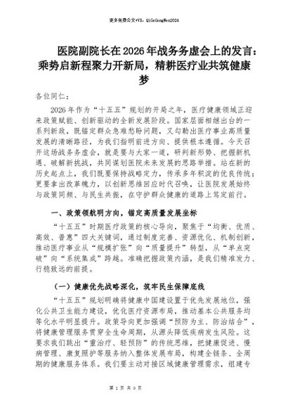 【七哥公文】2026年:医院副院长在2026年战务务虚会上的发言:乘势启新程聚力开新局,精耕医疗业共筑健康梦+更多免费公文+VX:QiGeGongWen2024