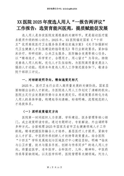 【七哥公文】2026年:XX医院2025年度选人用人“一报告两评议”工作报告:选贤育能兴医苑,提质赋能促发展+更多免费公文+VX:QiGeGongWen2024