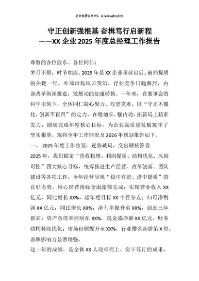 【七哥公文】2026年:守正创新强根基 奋楫笃行启新程——XX企业2025年度总经理工作报告+更多免费公文+VX:QiGeGongWen2024
