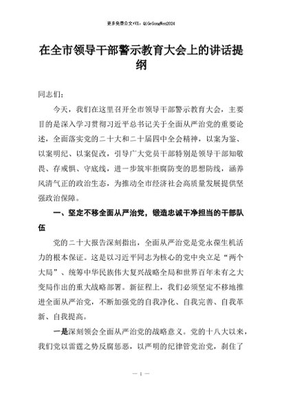 / 【七哥公文】2026年:在全市领导干部警示教育大会上的讲话提纲+更多免费公文+VX:QiGeGongWen2024