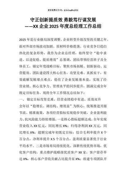 【七哥公文】2026年:守正创新提质效 勇毅笃行谋发展——XX企业2025年度总经理工作总结+更多免费公文+VX:QiGeGongWen2024
