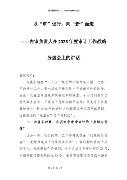 【七哥公文】2026年:内审负责人在2026年度审计工作战略务虚会上的讲话:以“审”促行,向“新”而进+更多免费公文+VX:QiGeGongWen2024