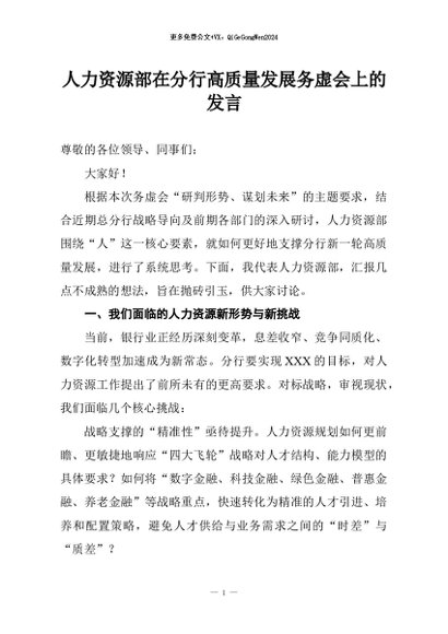 / 【七哥公文】2026年:人力资源部在分行高质量发展务虚会上的发言+更多免费公文+VX:QiGeGongWen2024