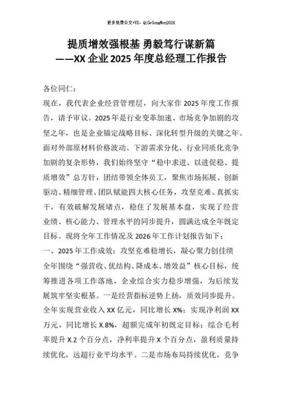 【七哥公文】2026年:提质增效强根基 勇毅笃行谋新篇——XX企业2025年度总经理工作报告+更多免费公文+VX:QiGeGongWen2024