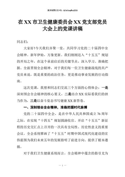 【七哥公文】2026年:在XX市卫生健康委员会XX党支部党员大会上的党课讲稿+更多免费公文+VX:QiGeGongWen2024